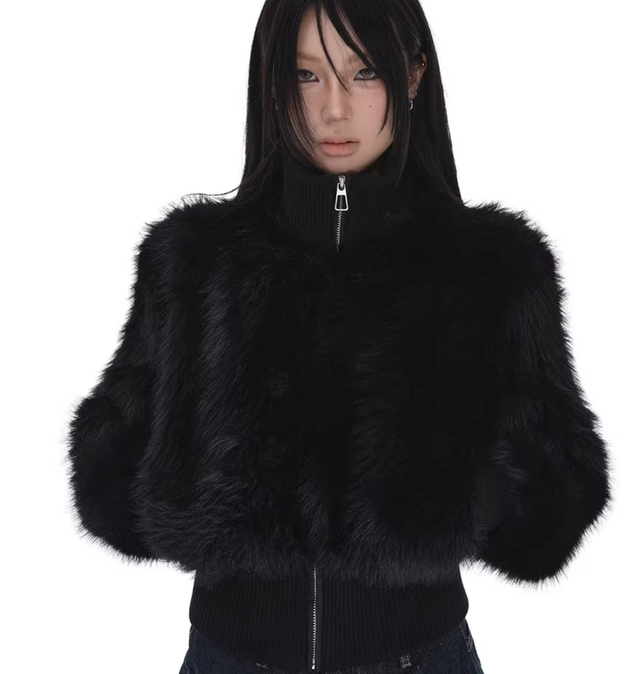 Cappotto Corto Nero di Prima Qualità con Collo alla Coreana in Finta Pelliccia Spessa Tessuta e Cerniera per Donne Petite Invernale