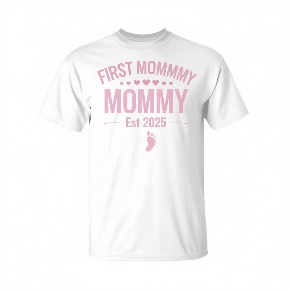T-Shirt 'First Mommy Est 2025' con Design di Cuori Rosa per Neomamme, Collo Tondo, Manica Corta, Stampa Digitale per Donne Adulte