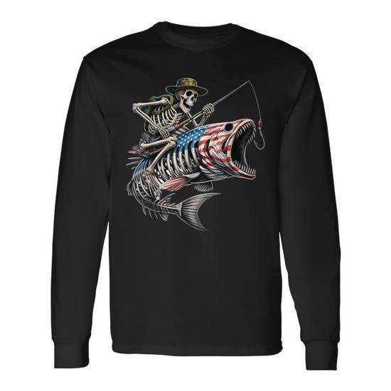 Fishing American Flag Bass Fish Skull Skeleton Fisherman Unisex Adult Digital Printed Long Sleeve T-Shirt