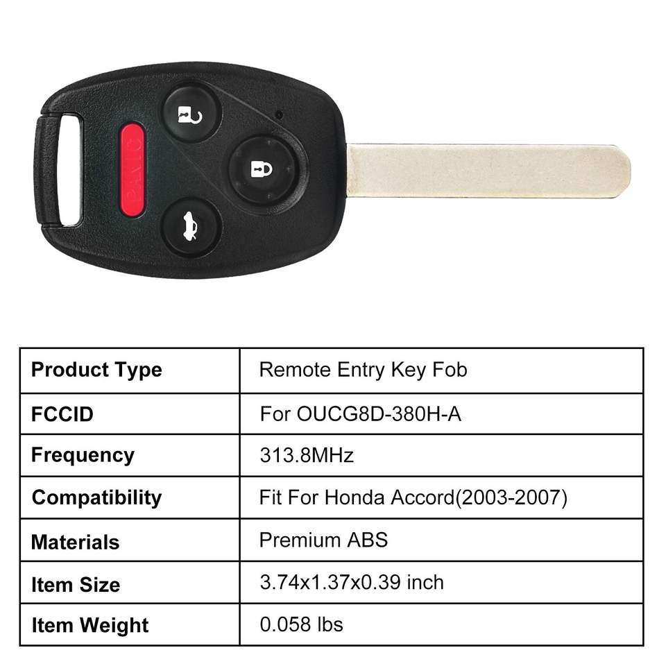 Guscio Coprichiave Nero Non Tagliato per Telecomando Auto Honda Accord 2003-2007, con Pulsanti, Modello FCCID 313.8MHz