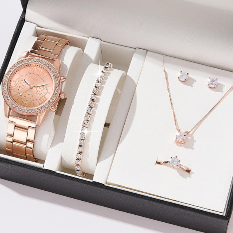 Five-piece Women's Gold-plated Rhinestone Set Quartz Watch Gift Jewelry Tennis Bracelet Fashion Wholesale