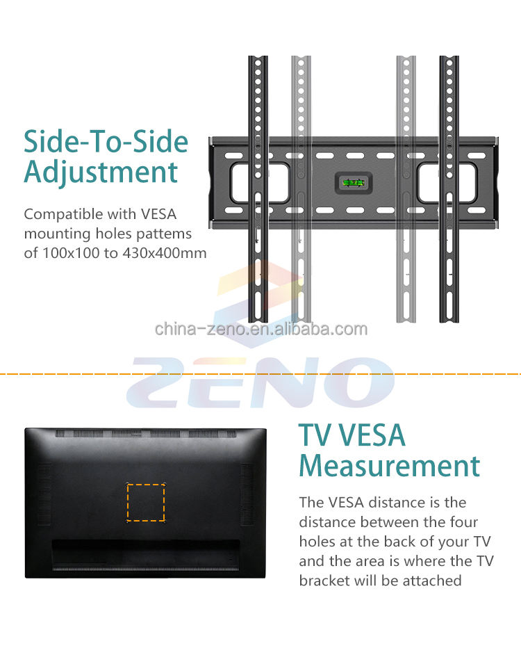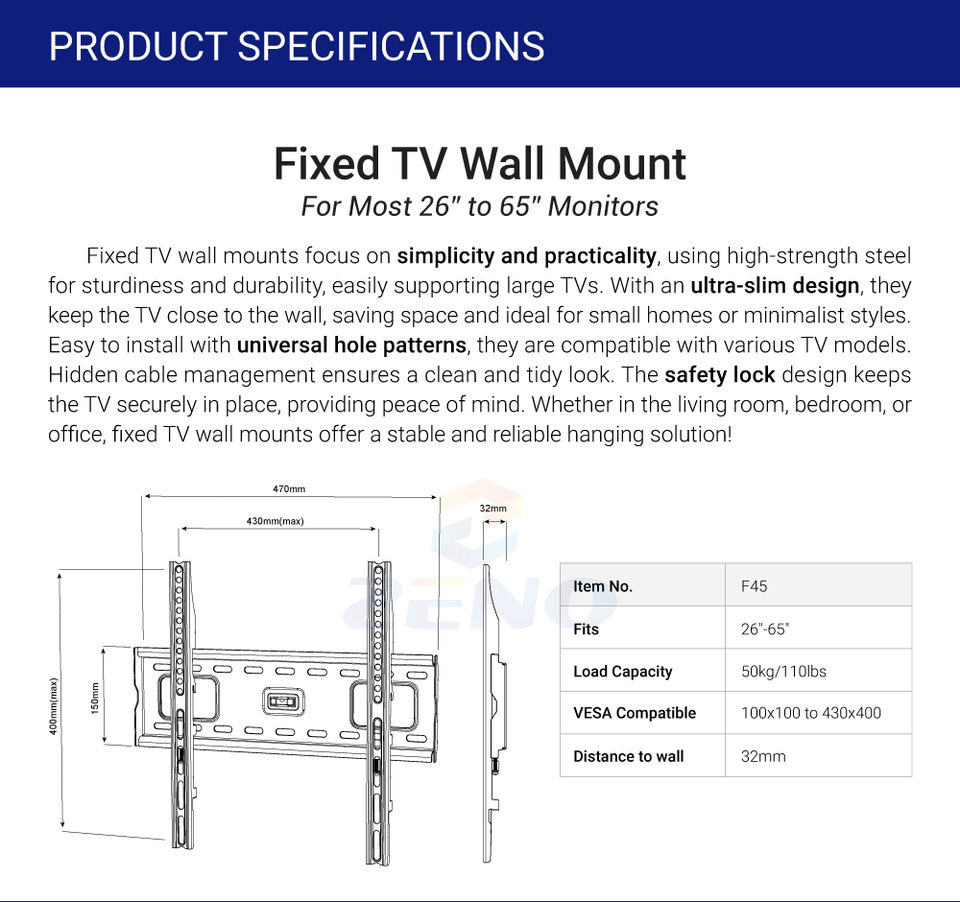 Supporto a Parete Fisso per TV da 26 a 65 Pollici, VESA da 100x100mm a 430x400mm, Supporto TV Durevole in Acciaio Laminato a Freddo Zeno F45