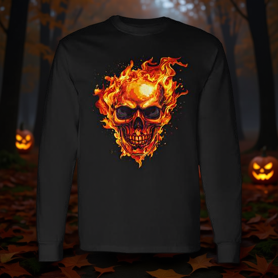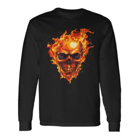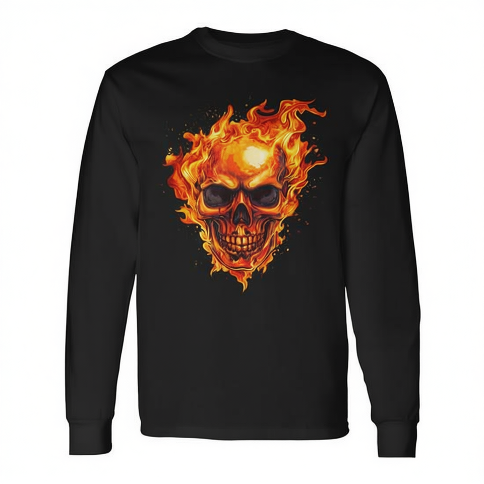 Flaming Skull Long Sleeve T-Shirt Adult Unisex Crew Neck Digital Printing Promotional Activities Halloween Horror Costume Design