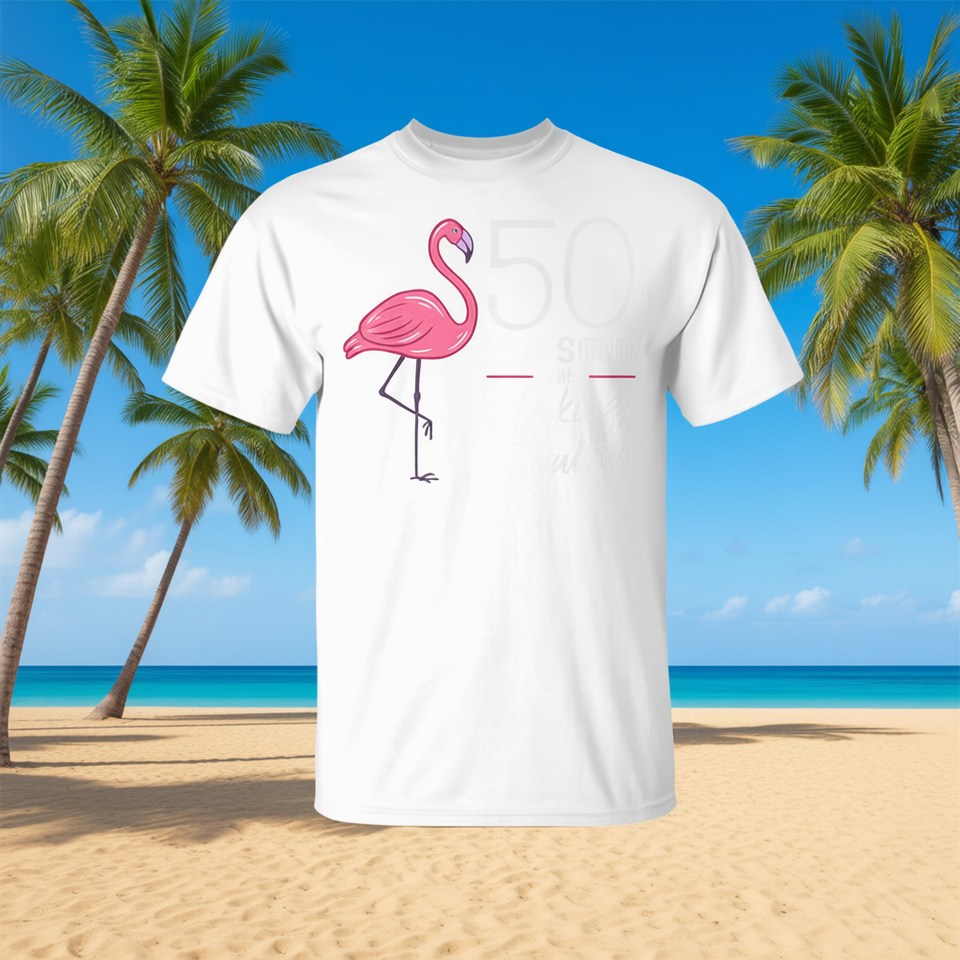 T-shirt promozionale per il 50° anniversario di Flamingo, con design a fenicottero, per 50 anni di esperienza