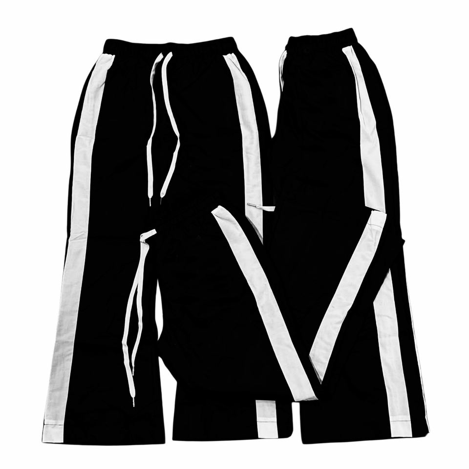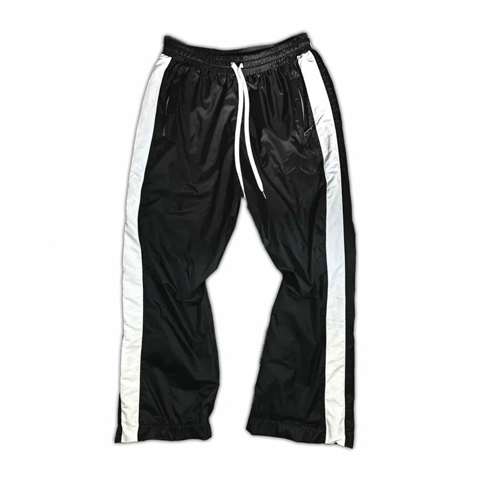 Pantaloni a Zampa d'Elefante da Uomo, Nero con Strisce Rosa e Bianche, Gamba Larga, Pantaloni Sportivi Baggy, Personalizzabili con Stampa DTG su Ampia Area, in Nylon, Design Esclusivo