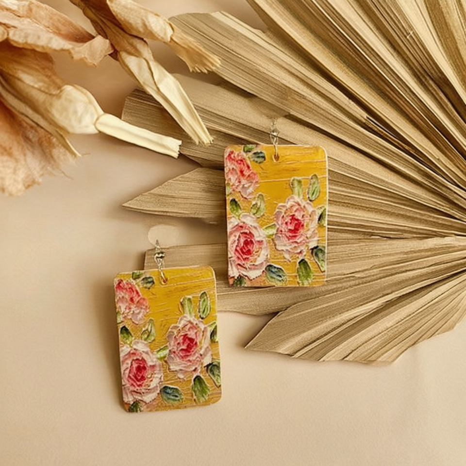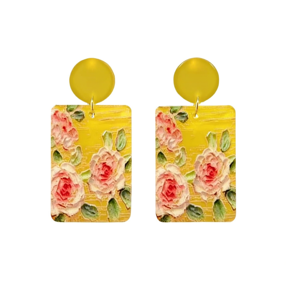 Orecchini con disegni floreali rettangolari gialli con rose per donna, gioielli di moda, 12 pezzi