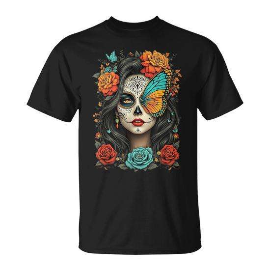 T-shirt da donna con stampa floreale Sugar Skull Day Of The Dead, design Dia De Los Muertos