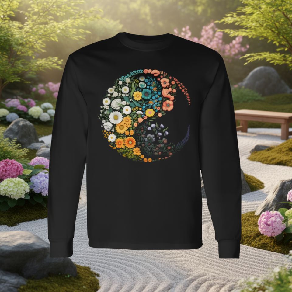 T-shirt a maniche lunghe con simbolo Yin Yang floreale, design Zen Taijitu, stampa digitale, unisex
