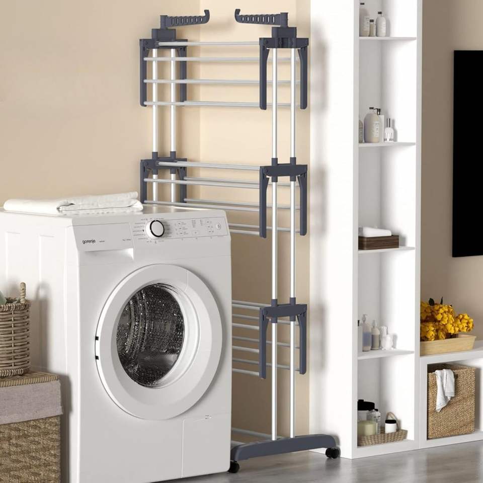 Stendibiancheria Pieghevole a 4 Ripiani in Acciaio Inox Portatile con 24 Aste Appendiabiti, 14 Ganci, Altezza 172 cm, 4 Ruote per Asciugatura