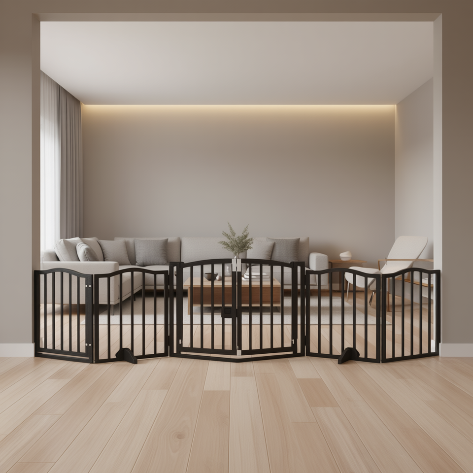 Cancelletto per cani pieghevole a 6 pannelli, 118,1 pollici, in legno di pioppo nero, stile moderno per interni, chiusura a pressione