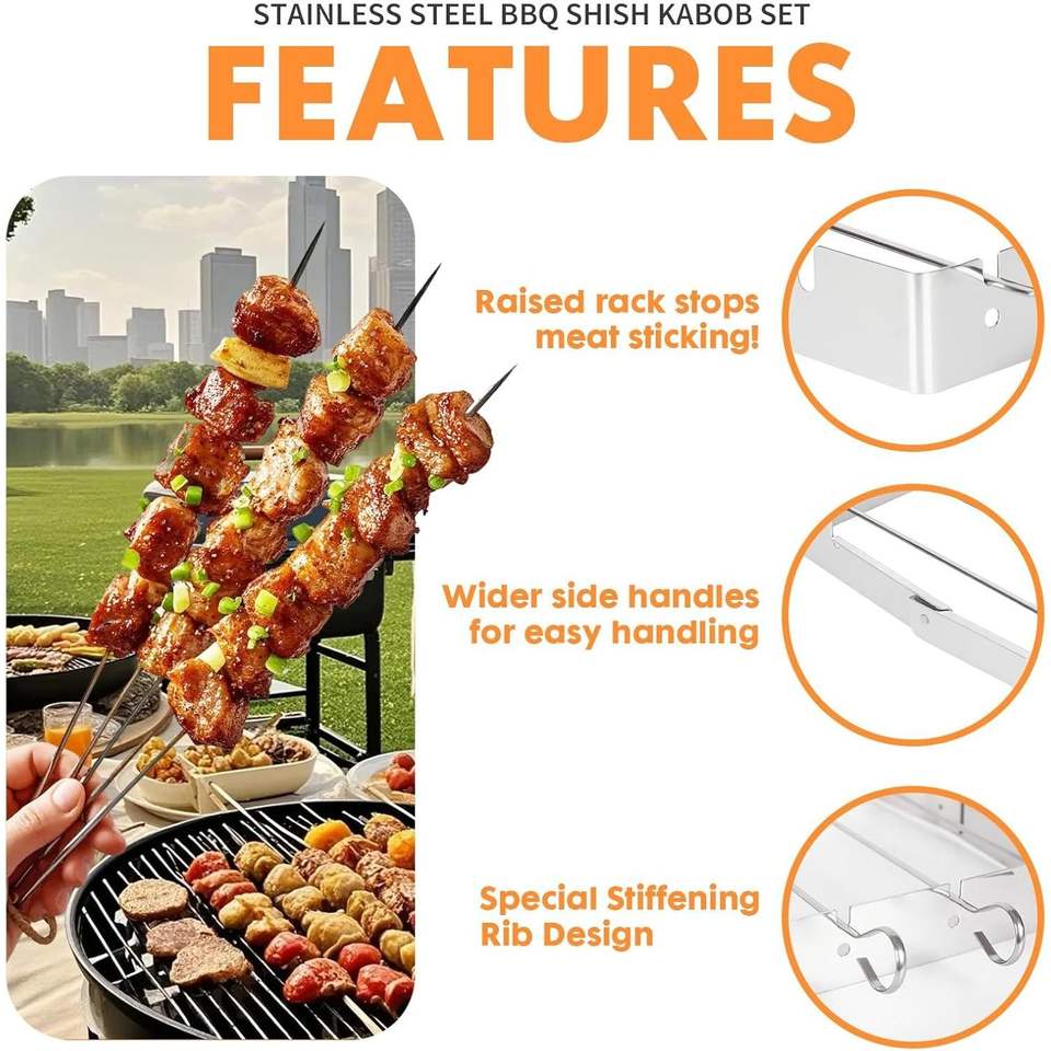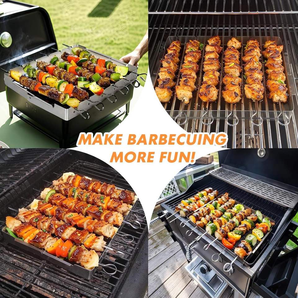 Griglia BBQ Pieghevole in Acciaio Inox con Set di 6 Spiedini Riutilizzabili da 33 cm per Feste e Cene all'Aperto e al Chiuso