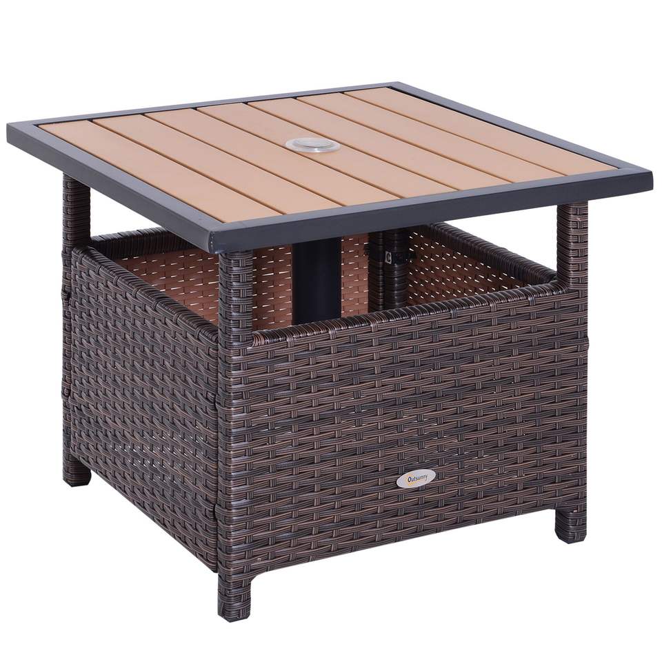 Tavolino Laterale in Rattan da 22'' con Struttura in Acciaio, Foro per Ombrellone e Sacchetto di Sabbia per Esterni, Patio e Giardino, Colore Marrone