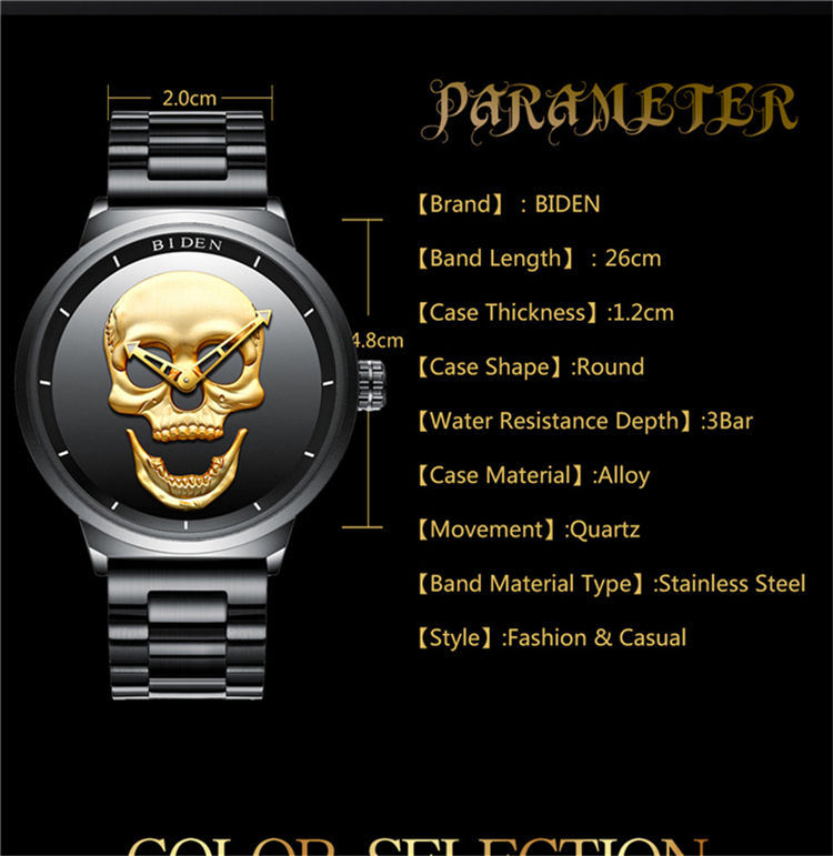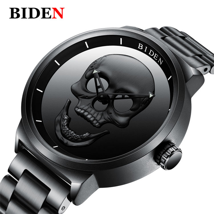 Per gli uomini di BIDEN 0063 orologio al quarzo nero in acciaio inossidabile impermeabile 1 Punk 3D teschio stile retrò Business Cartoon stile unico tutti