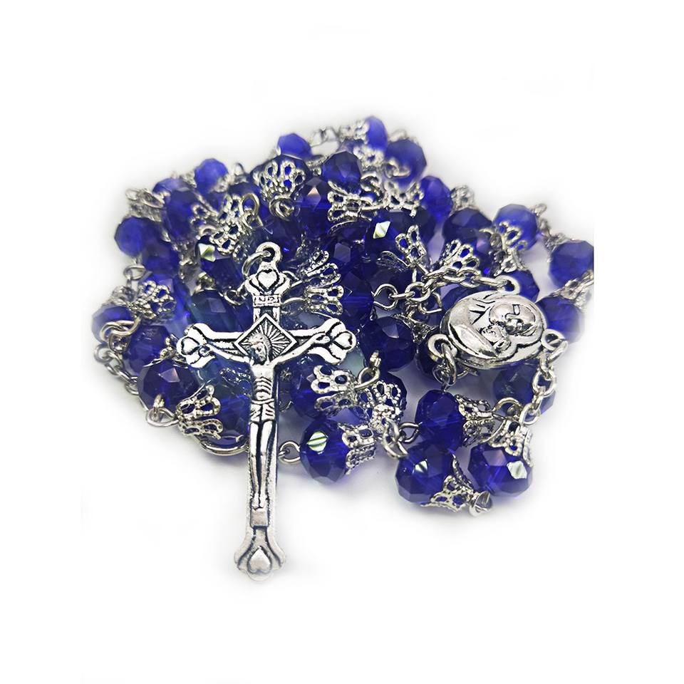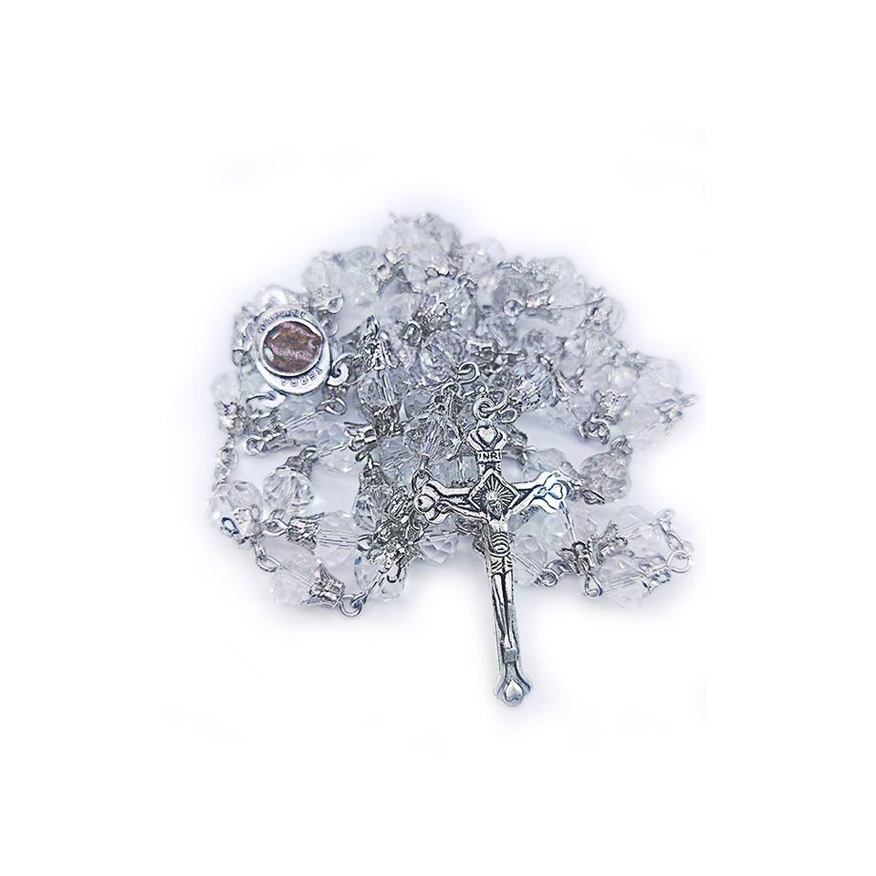 Rosario di Cristallo di Gerusalemme - Perle Sfaccettate da 8mm con Croce in Legno d'Ulivo e Ciondolo Placcato Argento Antico, Collana Religiosa Cattolica