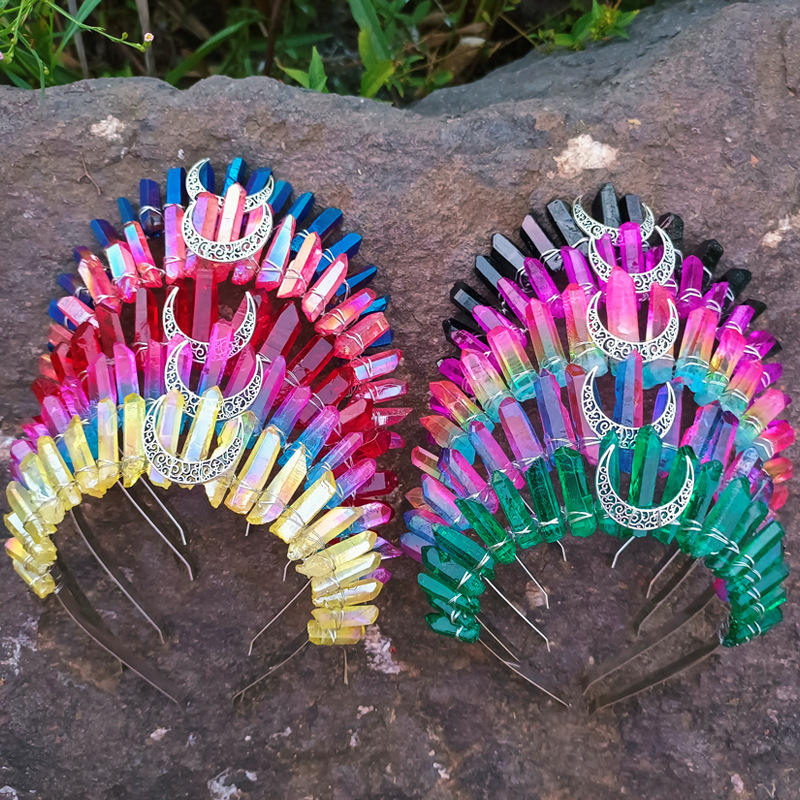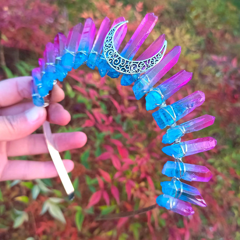 Elegante Fascia per Capelli con Corona a Mezzaluna in Cristallo Naturale Elettroplaccato Colorato, Stile Wicca, Blu Scuro e Nero