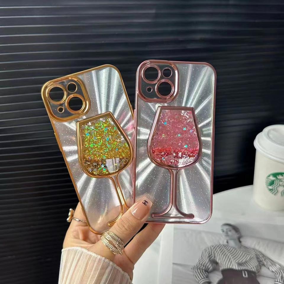 For IPhone16/15/14promax Plastic Soft Glue Electroplating Glitter Sheet Quicksand High Heel Wine Glass Transparent Phone case