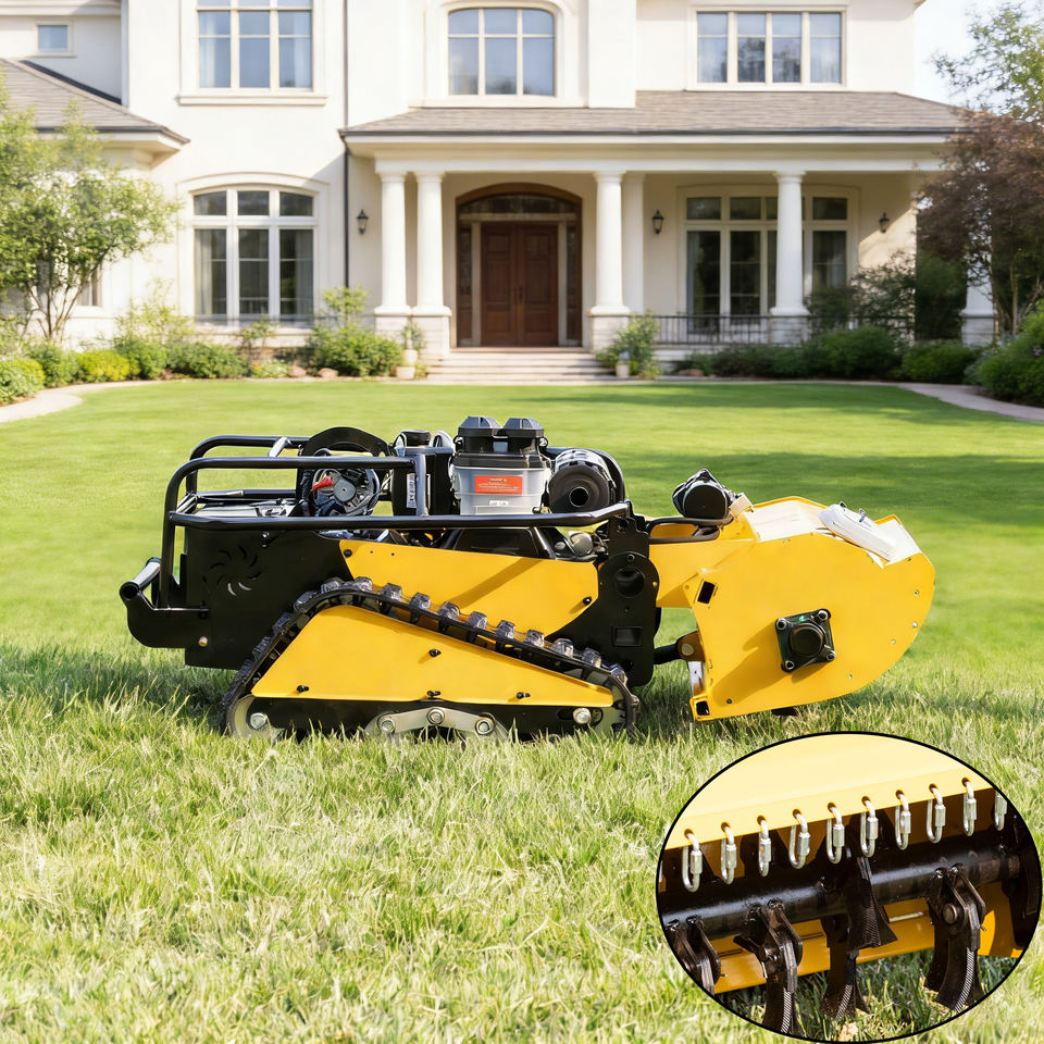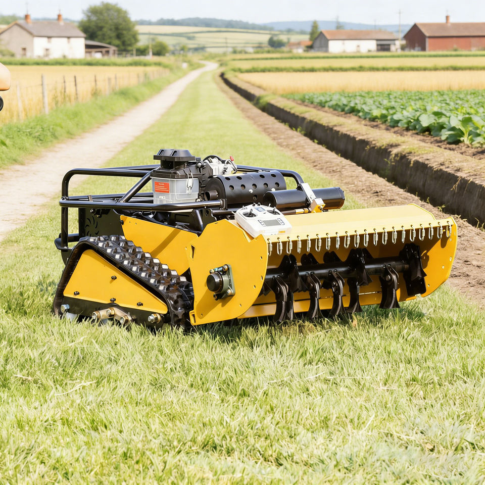 Falciatrice a flagelli per la gestione dei prati con altezza di taglio regolabile, avviamento remoto, doppio motore brushless e controllo a distanza
