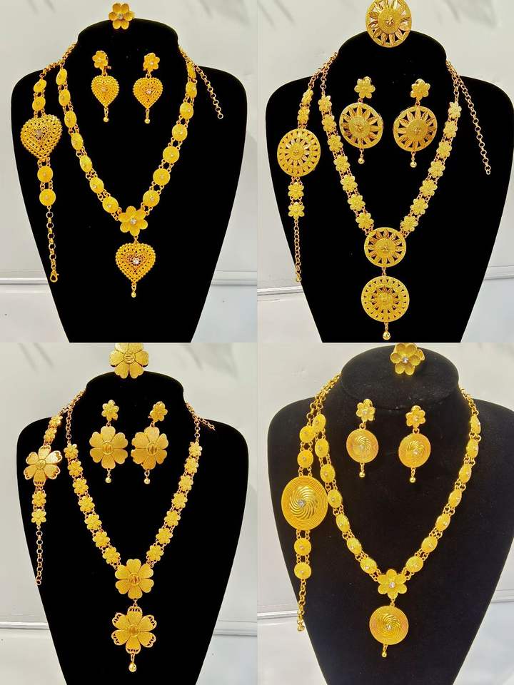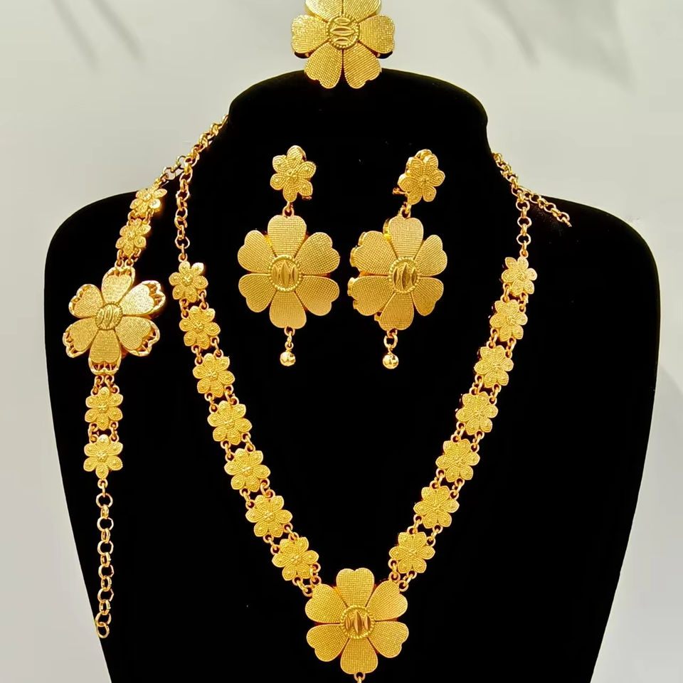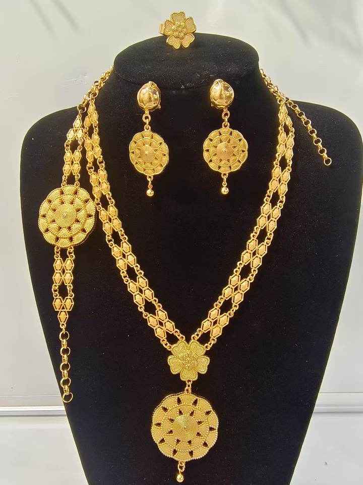 Set di gioielli africani in oro riempito di Dubai a quattro pezzi, set di collana e orecchini in oro giallo 14k, gioielli neri africani