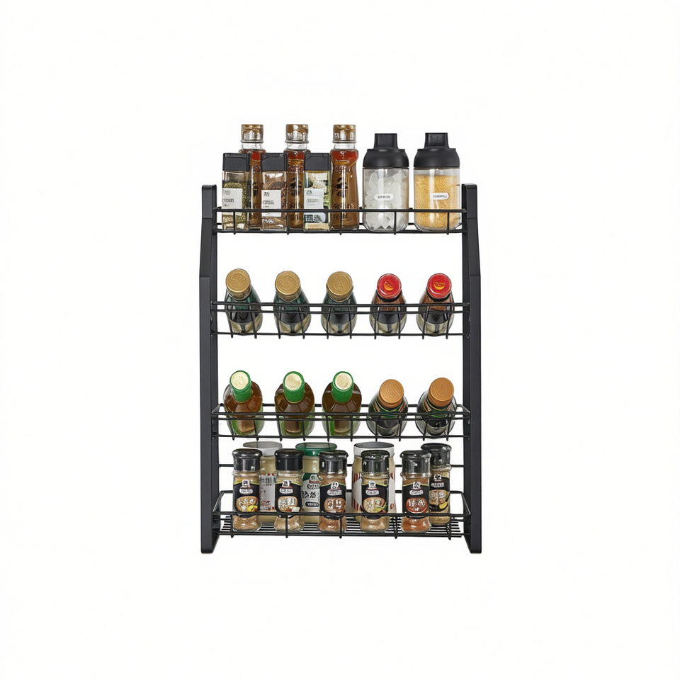 Scaffale porta spezie a quattro livelli in metallo con barattoli per uso su bancone