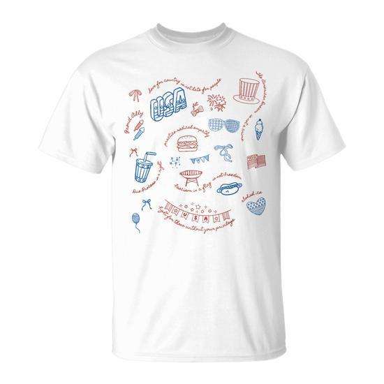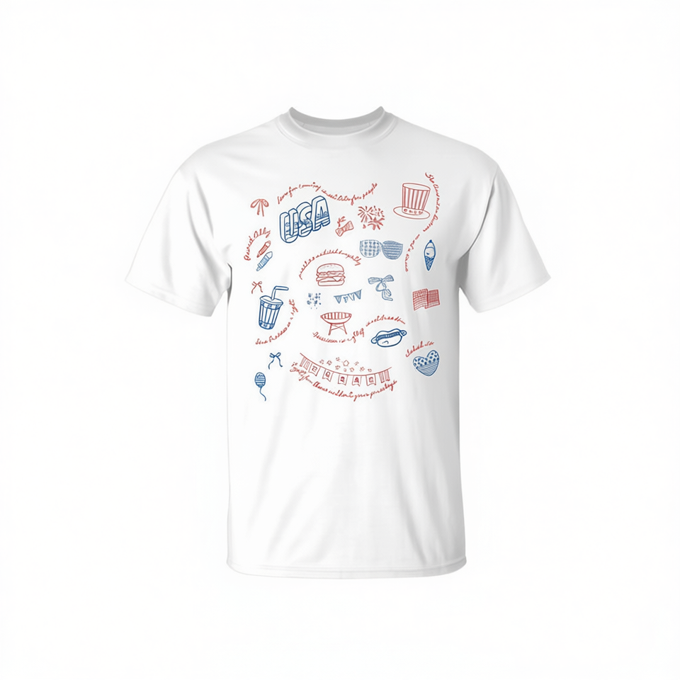 T-shirt con disegno a tema 4 luglio con messaggio subtilmente sfumato, design a tema americano rosso bianco blu