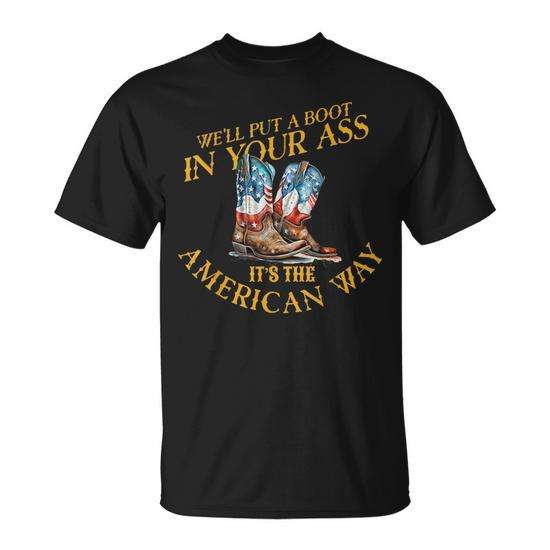 T-shirt del quattro luglio con bandiera americana, stivali da cowboy, design patriottico, camicia da uomo