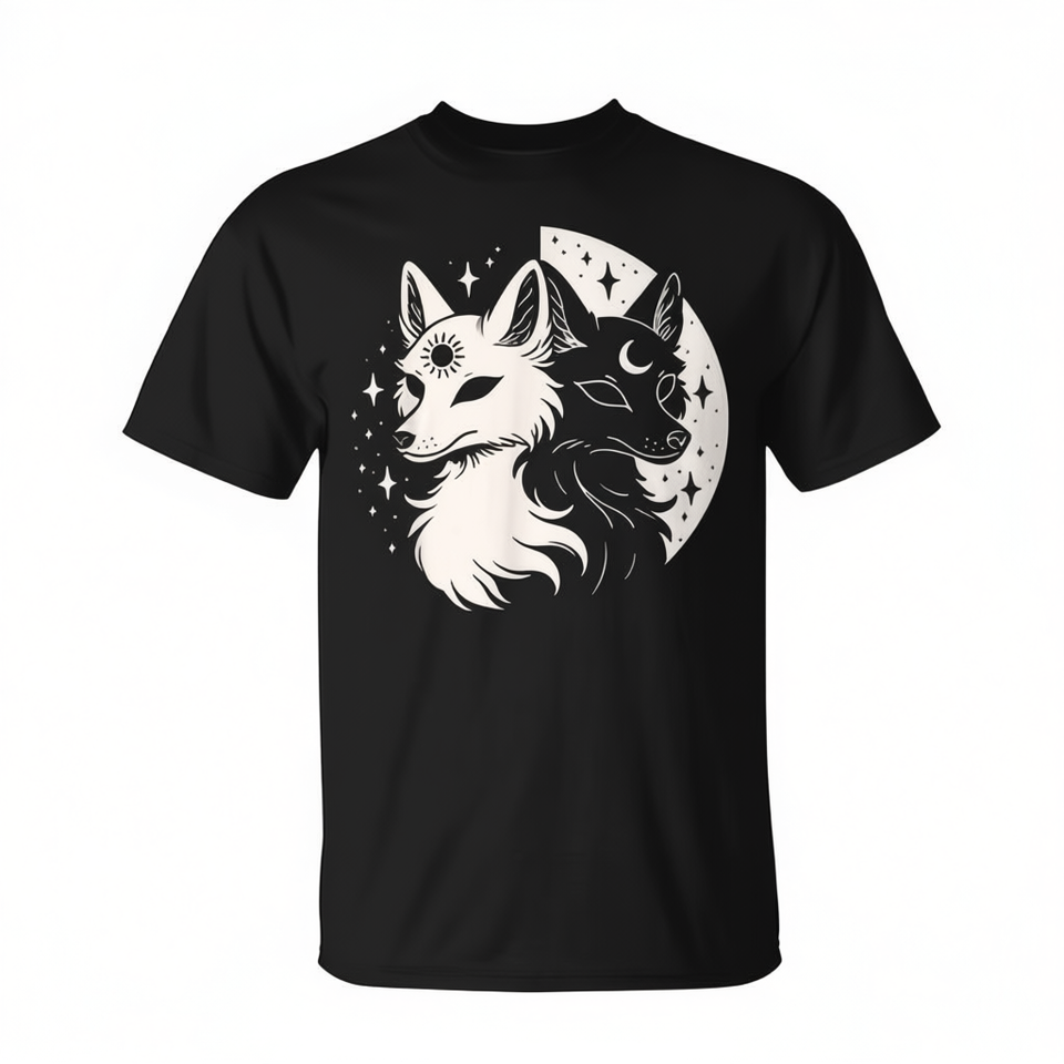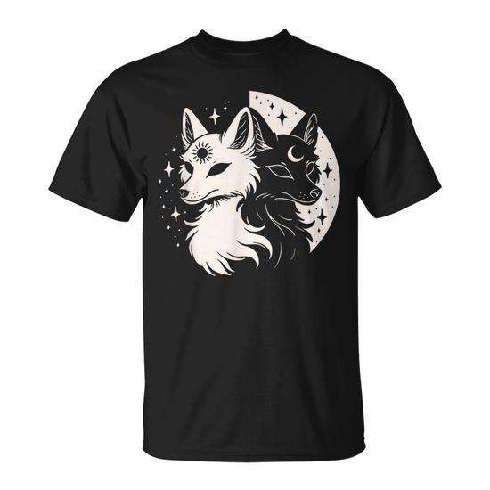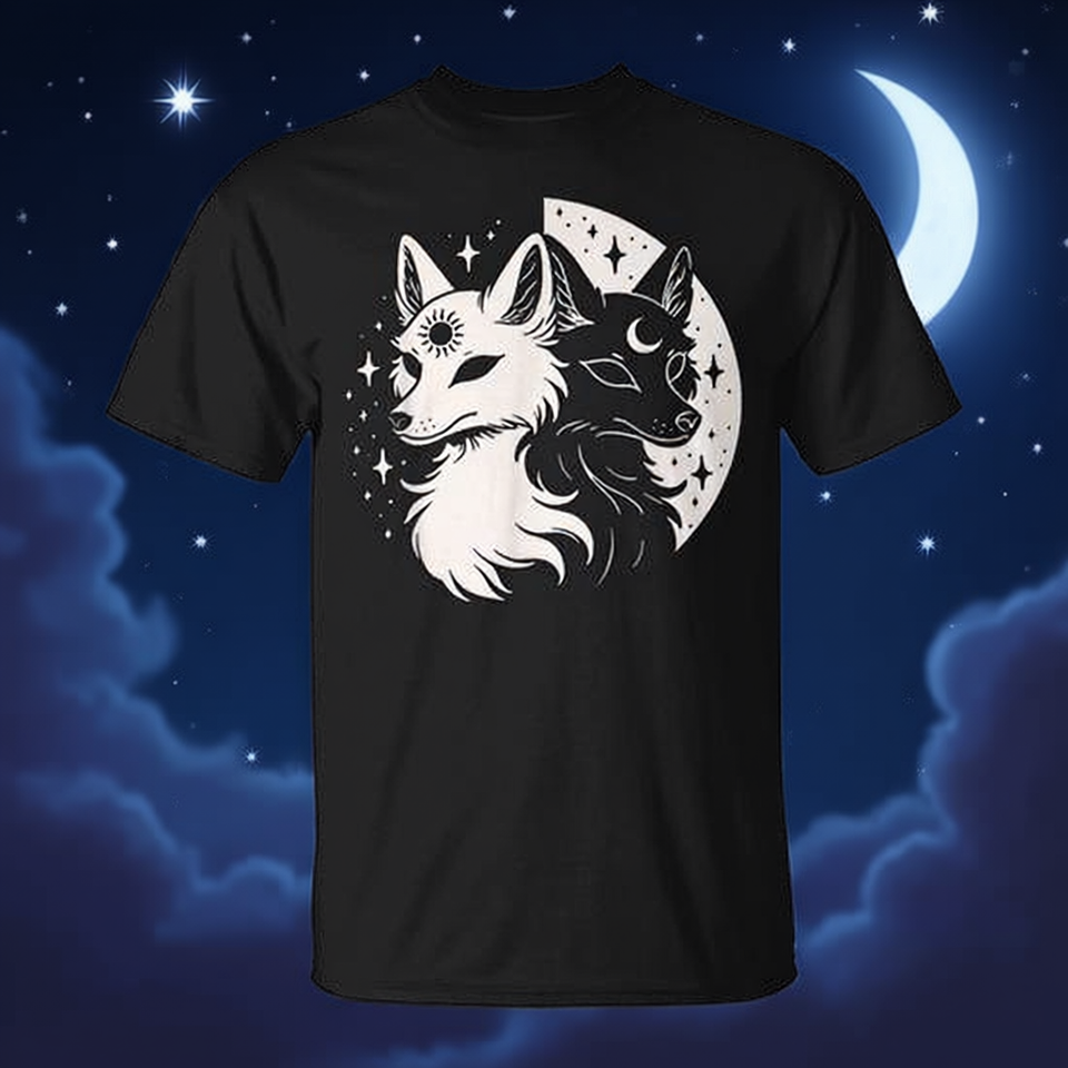 T-shirt Fox Spirit Celestial Moon con Volpi, Luna, Notte, Sole e Stelle per Promozioni Giorno Notte Sole