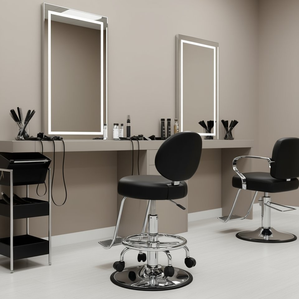 Sgabello da Salone in Pelle Sintetica Nera con Piedini Ha Ha, Arredamento Commerciale per Uso Professionale