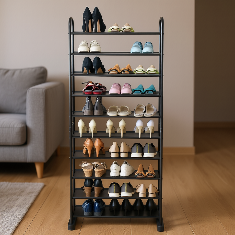 Scarpiera in Metallo a 10 Ripiani Nera Estensibile Autoportante Design Moderno Minimalista Arredamento per Soggiorno Uso Domestico