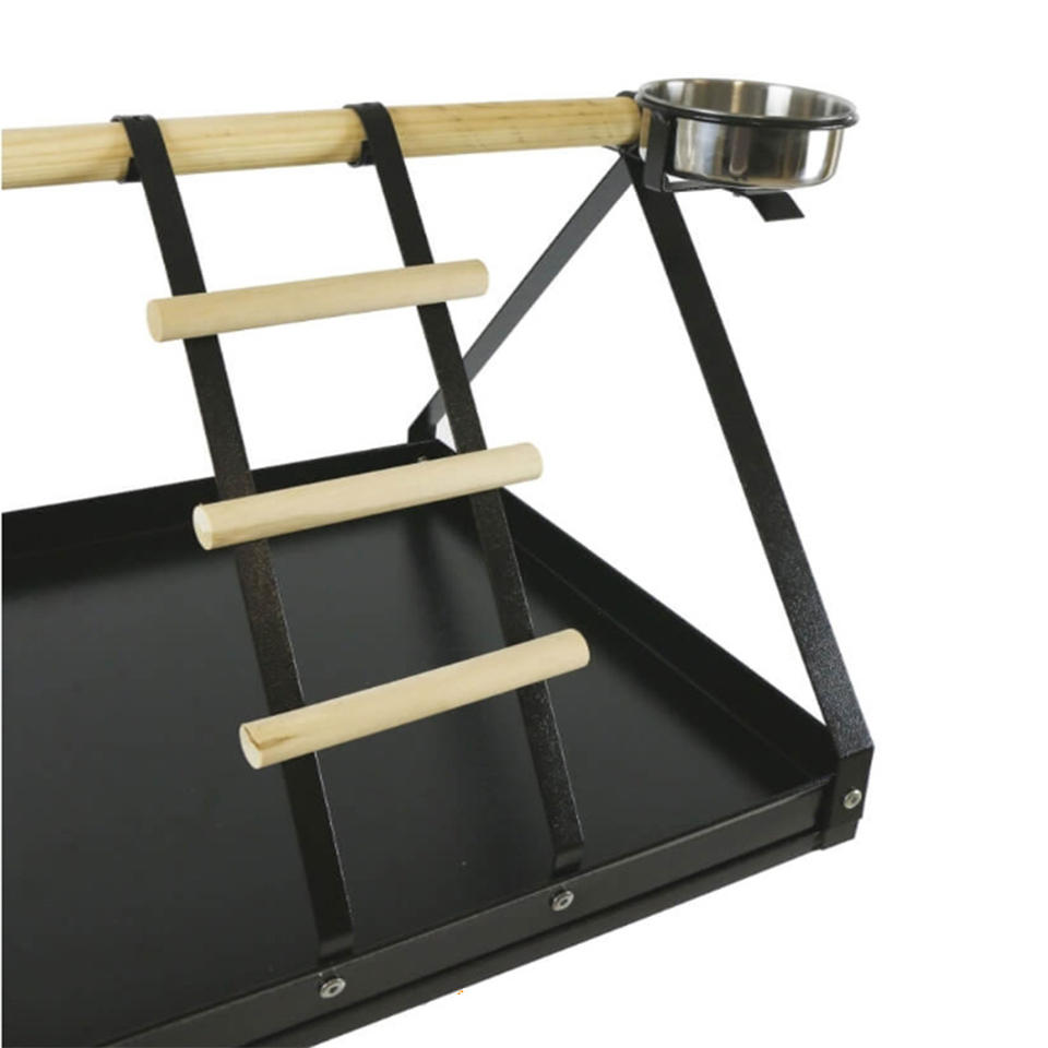 Supporto per Uccelli Autoportante Contemporaneo in Metallo Nero, Stand a T, Posatoio in Ferro Battuto con Ciotole per Mangime e Vassoio Raccogli-Sporco per Pappagalli