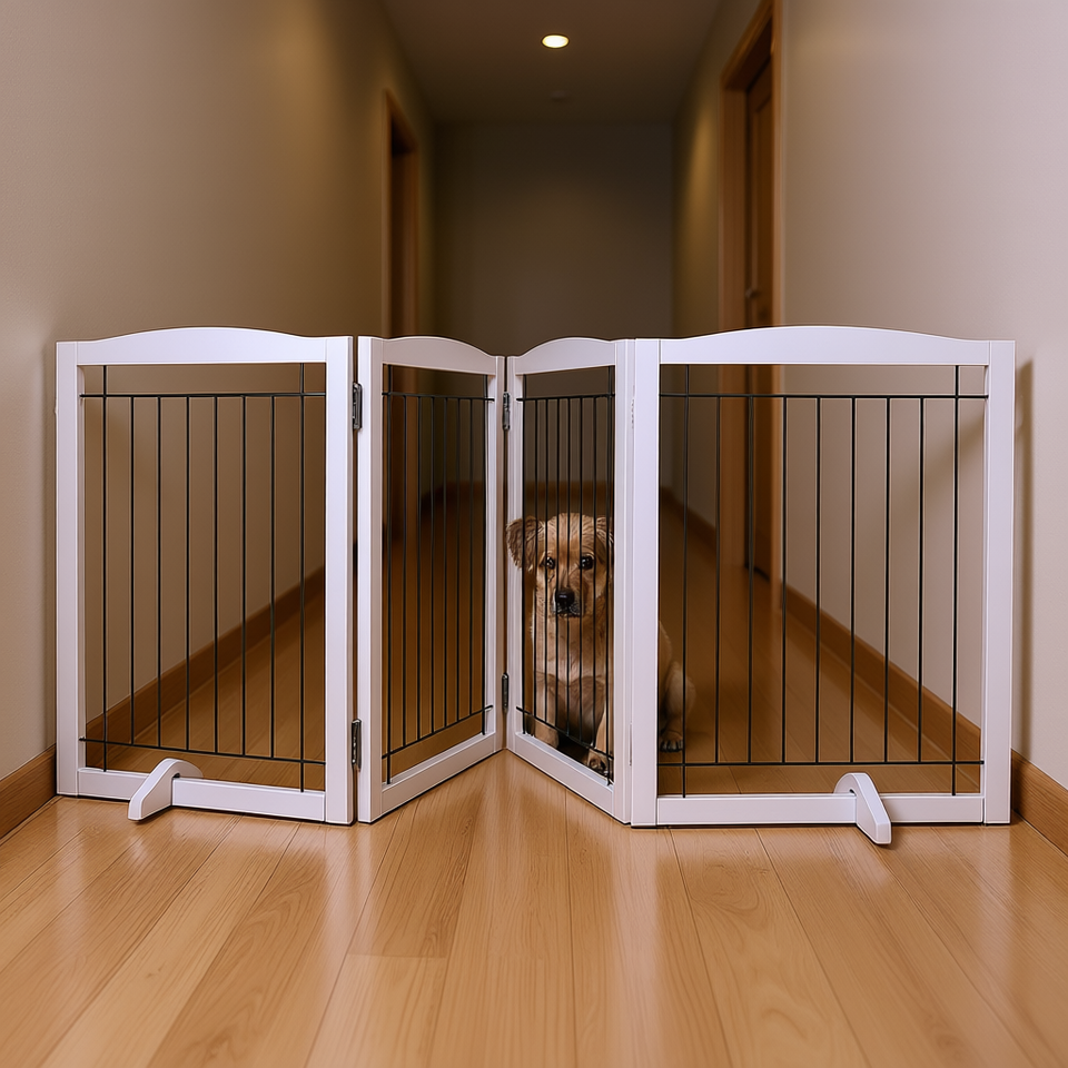 Cancelletto per cani 32 pollici (A) x 96,5 pollici (L) a 4 pannelli, barriera pieghevole autoportante per animali domestici, design moderno, struttura in metallo