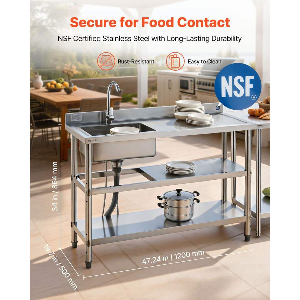Lavello Commerciale Autoportante a Vasca Singola con Rubinetto da Cucina in Acciaio Inossidabile e Tubi per Acqua Calda e Fredda