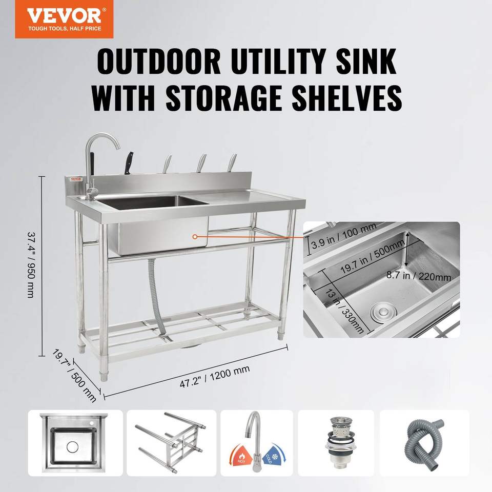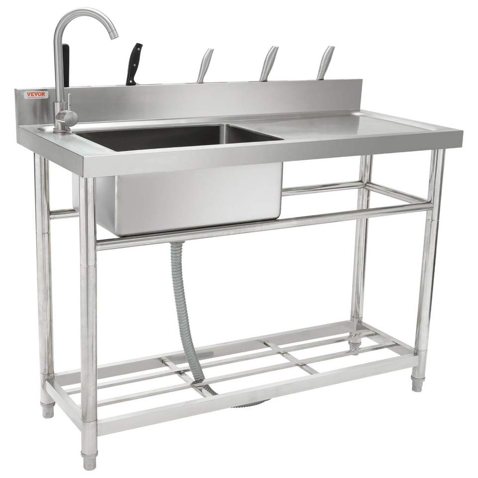 Lavello Commerciale Monoblocco Autoportante per Cucina 47 X 19.7 X 37.4 in Acciaio Inossidabile, Set Lavello Utilitario in Acciaio Lavorato