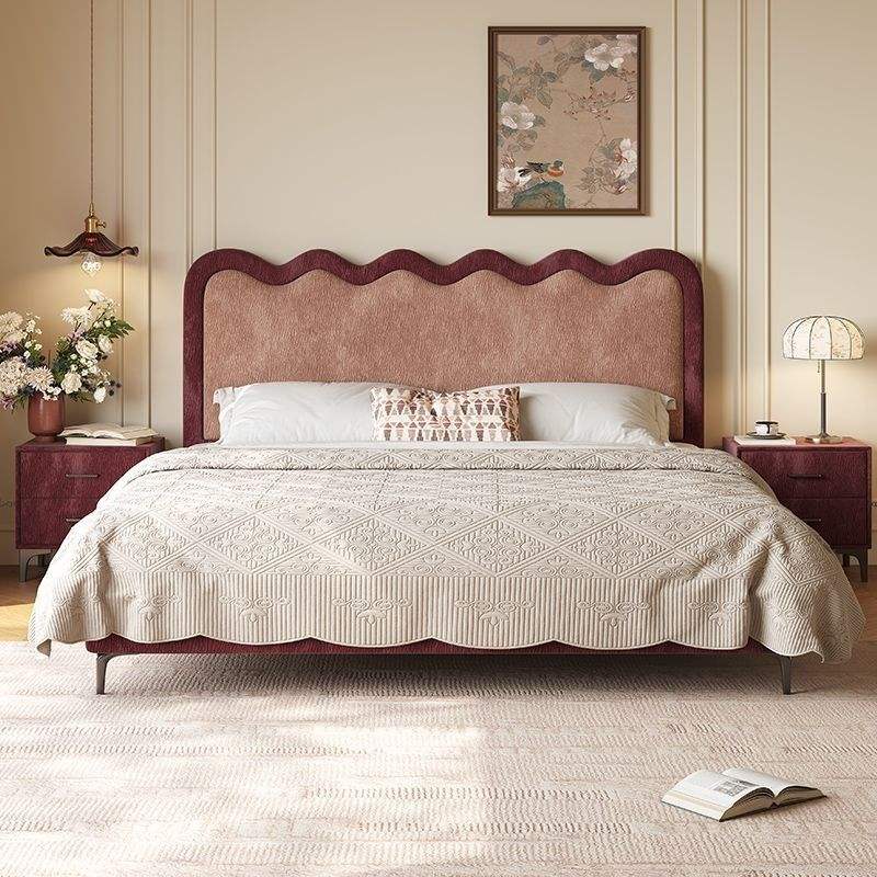French Chenille Fabric Upholstered Queen Size Bed Wooden Eco-Friendly Luxury Bedroom Furniture Set Comfortable Cute Wavy Bedside