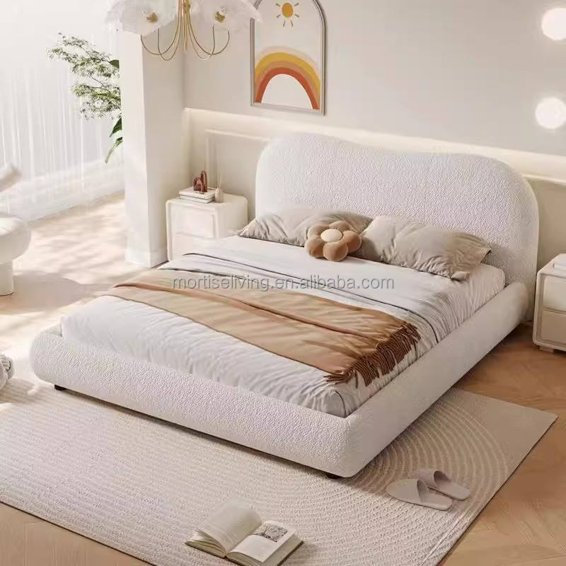 Letto Matrimoniale Lussuoso in Stile Crema Francese con Struttura in Legno di Pino, Rivestimento in Tessuto e Cuscino a Nuvola in Pelliccia di Agnello Bianco per Camera da Letto di Ragazze