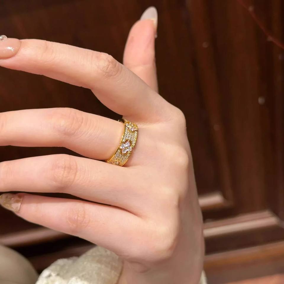 French Luxury Gold Silver Plated Full Diamond Lucky Flower Rings Adjustable Cubic Zircon Four Leaf Clover Ring for Party Gifts