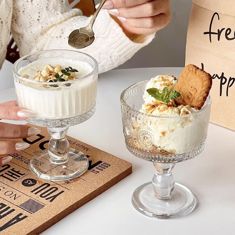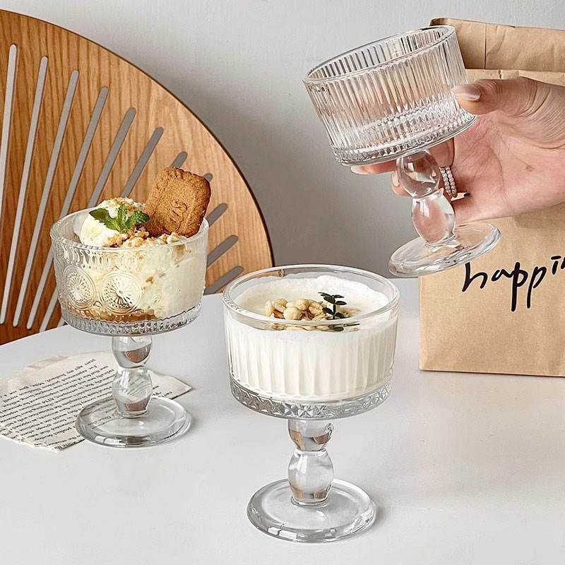 Francese Retro incide in vetro alto piccola ciotola da Dessert cilindro portacandele budino tazza di bicchiere di vino calice
