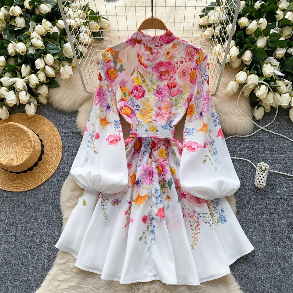 French Retro Standing Collar Lantern Sleeve Printed Dress for Women Autumn New Collection Waist Slimming A-line Short Dresses