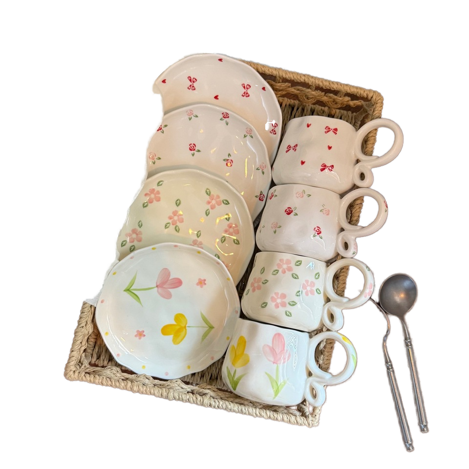 Set di Tazza e Piattino in Porcellana Dipinta a Mano in Stile Retrò Francese con Design Floreale Artigianale - Regalo per Amici