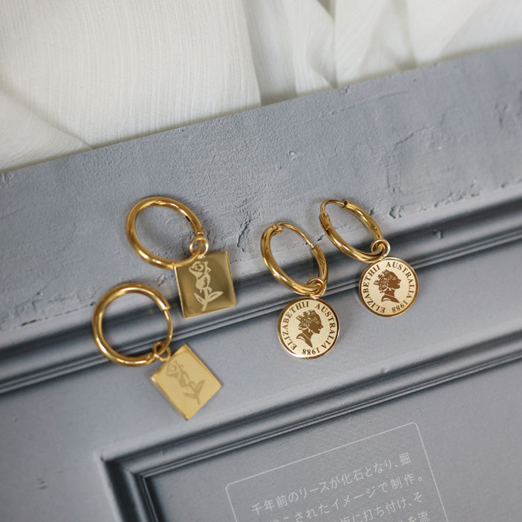 French Rose Flower square Coin Earrings Queen Elizabeth Portrait Huggies Earrings Gift for Her Elegant Jewel 18 Karat Gold Lady