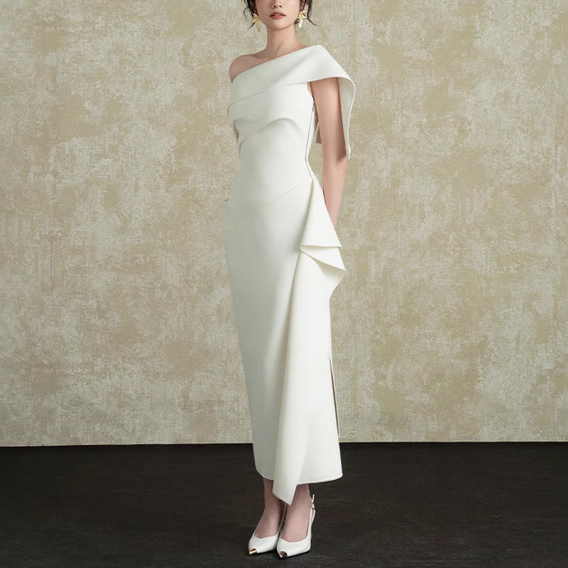 Abito Slim Fit Slim con volant a collo inclinato della Socialite francese 2025 nuovo elegante abito bianco con spacco