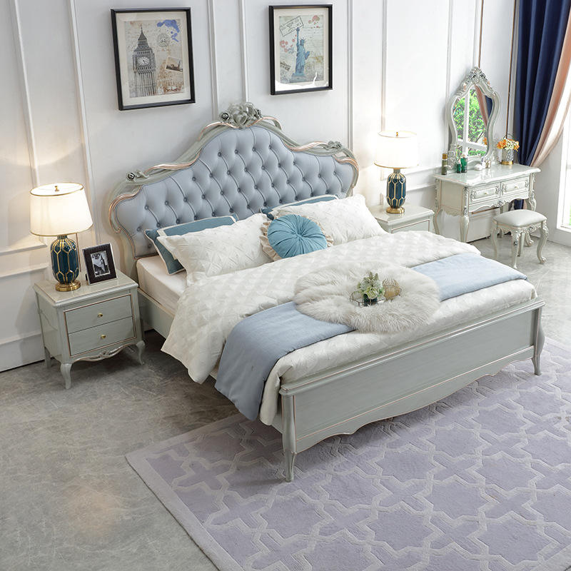 French Style King Size Bed with Tufted Blue Leather Headboard and Carved Wood Frame, Elegant Bedroom Furniture Set