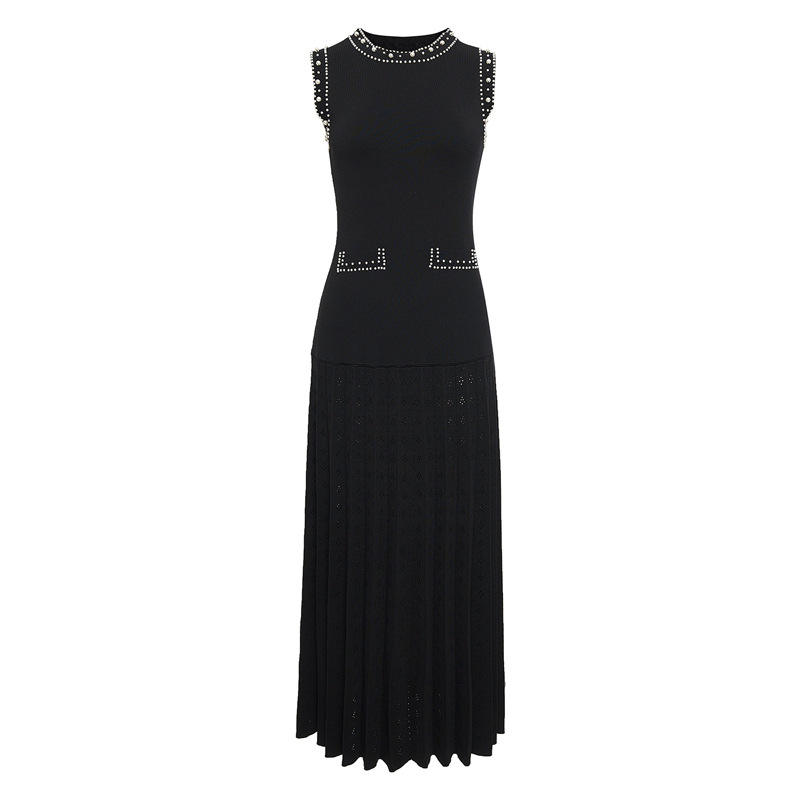 Abito a girocollo senza maniche plissettato lungo fino al pavimento in stile francese stampa digitale solido primavera estate lavorato a maglia da donna