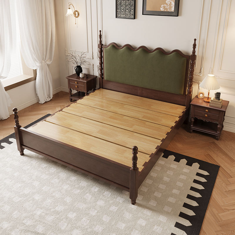 French Vintage Solid Wood Double Bed American Luxury Wedding Bed Frame in Burgundy Wave Modern Design for Master Bedroom