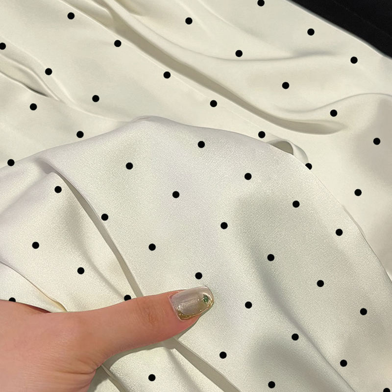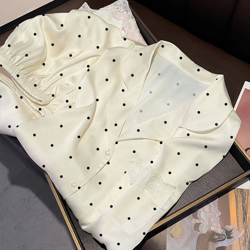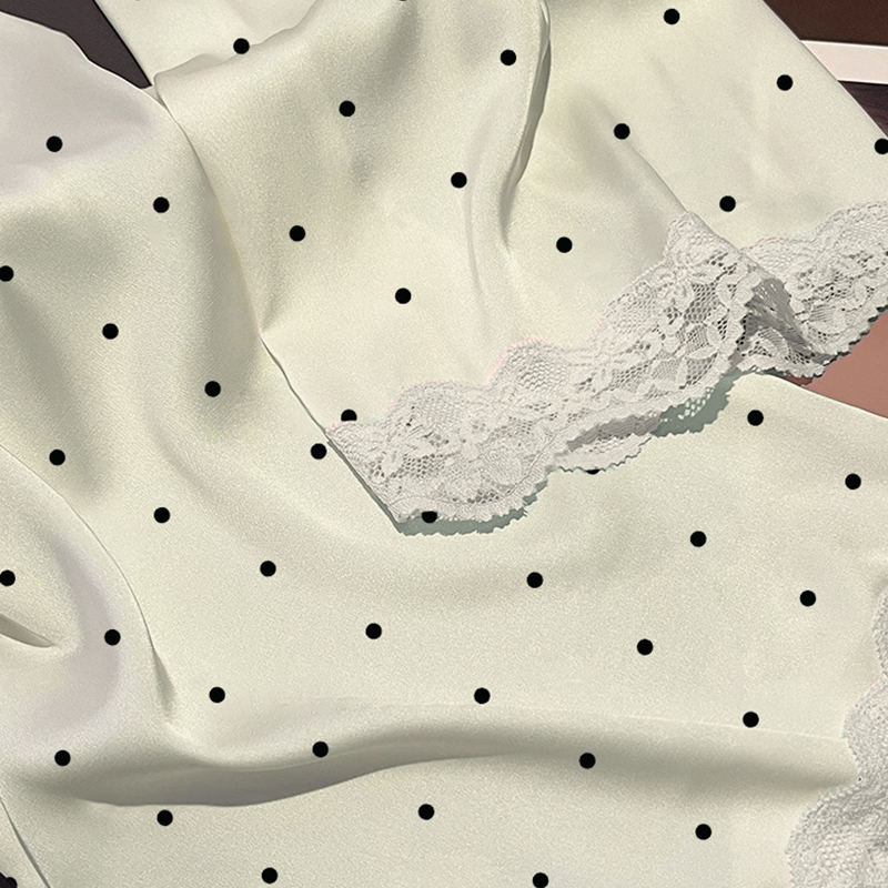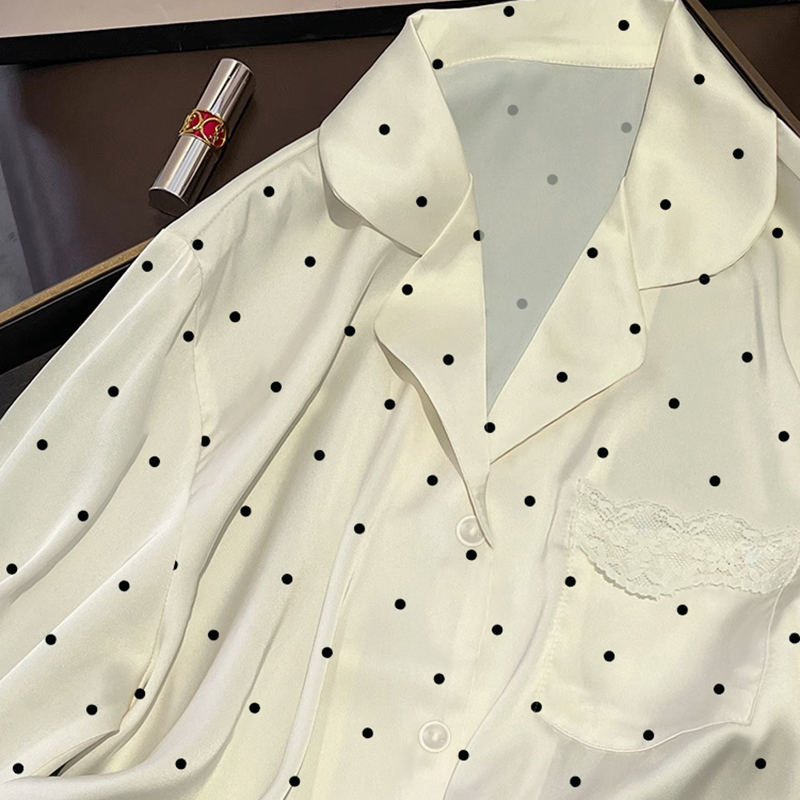 Camicia da Notte in Stile Francese con Pizzo e Imitazione Seta: Nuova Collezione Primavera/Autunno, Maniche Lunghe, Semplice Motivo a Pois