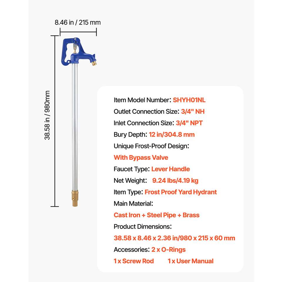 Rubinetto da Esterno Antigelo 3.22FT (100cm) con Attacco Tubo NPT da 3/4'' e Raccordo Tubo NH da 3/4''