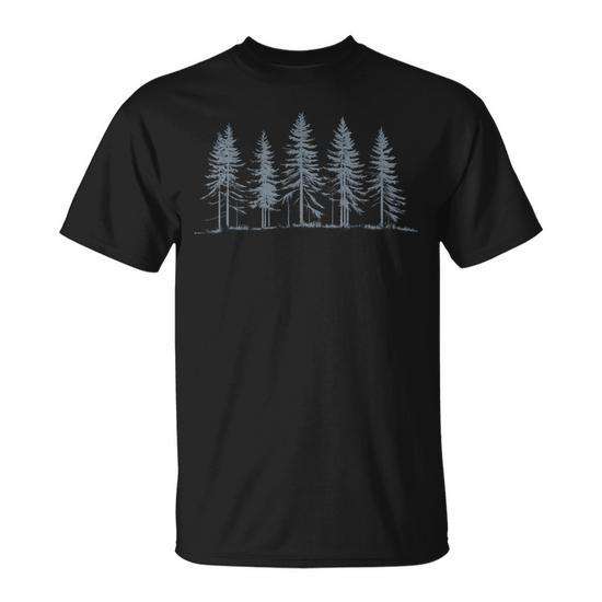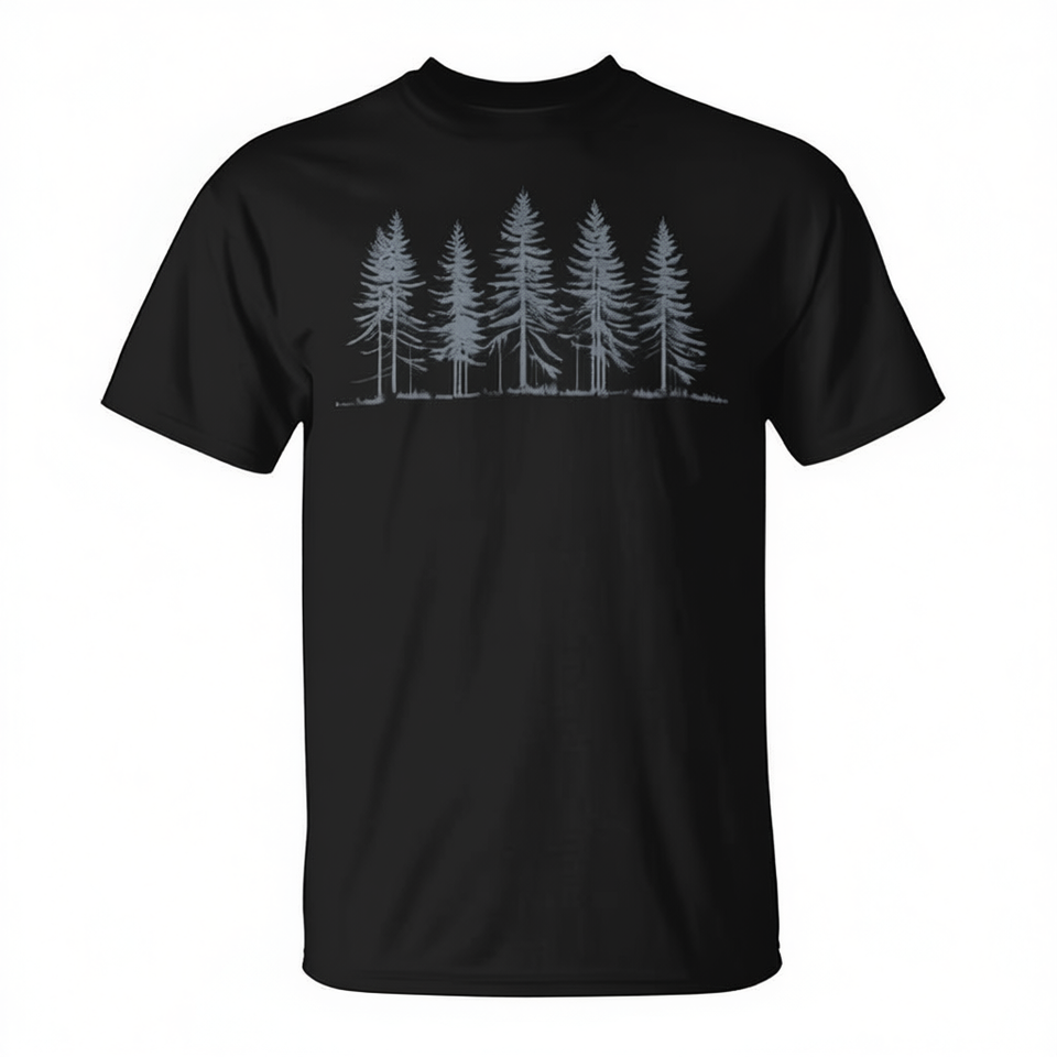 T-shirt promozionale con silhouette di alberi di pino innevati