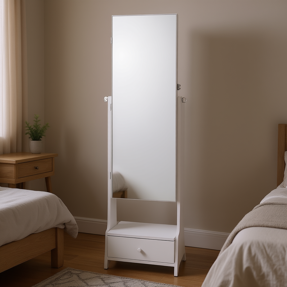 Full-Length White Standing Mirror Jewelry Cabinet With Storage Drawer Minimalist Design For Bedroom Use