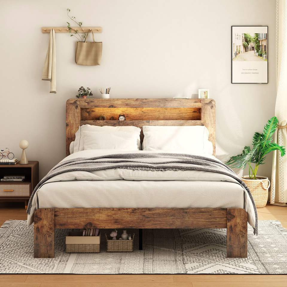 Letto a piattaforma in legno a grandezza naturale con testiera illuminata a LED e 2 porte USB, silenzioso, senza bisogno di rete a molle, con opzione contenitore