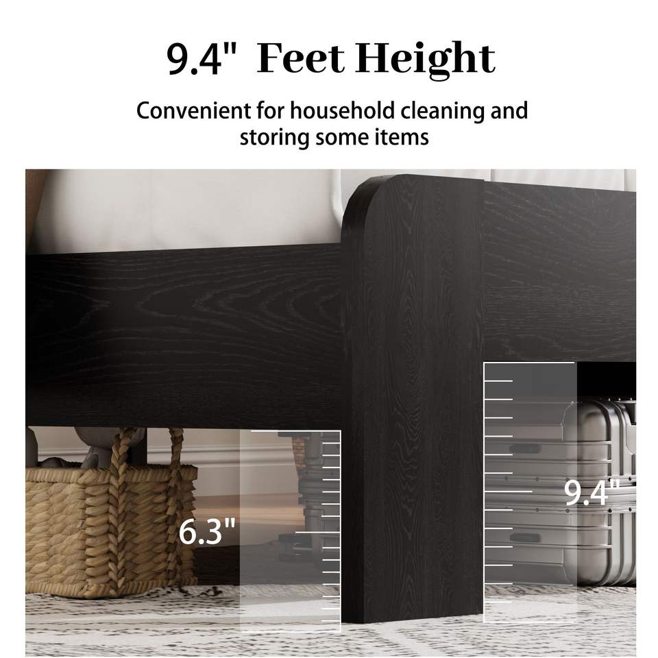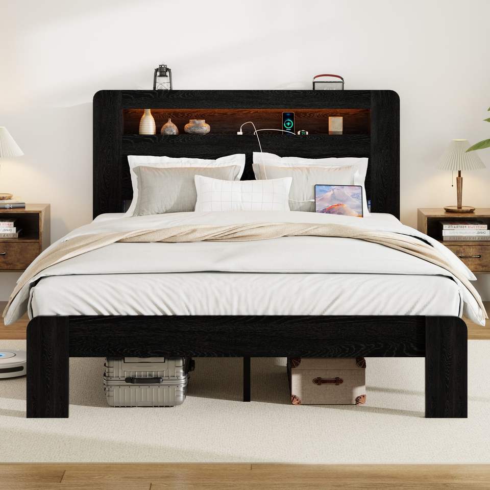 Letto Matrimoniale in Legno con Testiera Illuminata a LED e 2 Porte USB, Silenzioso, Senza Necessità di Rete a Doghe, con Vano Contenitore Integrato
