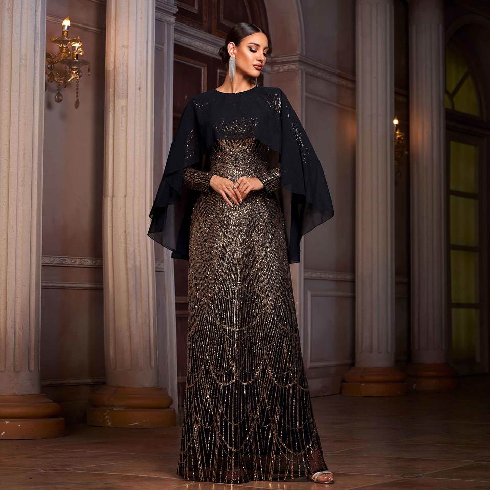 Abito da Sera Lungo Modesto Musulmano con Paillettes e Maniche Lunghe a Linea ad A Stile Arabo Turco Marocchino di Istanbul e Dubai